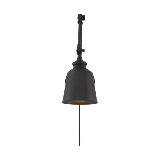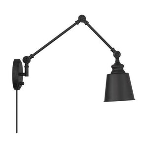 This 2-pack of adjustable sconces boasts convenient, fashionable illumination that is perfect for adding extra light and style in any room. For added convenience, these sconces can even be plugged in to any standard wall outlet, or you can hard-wire them. Matte Black finish. Adjustable height ranges from 17" to 26". 5.75" width. Wall extension ranges from 12" to 31". Backplate 5" diameter. Max 60 watt bulb, standard size A19 bulbs recommended. Bulb not included. Damp area rated. Set of 2 sconces.